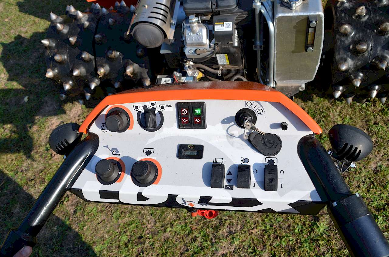 Der Clou aber sind die drei Dreh-Potenziometer, mit denen Motordrehzahl, die Drehzahl des Anbaugerätes geregelt sowie die maximale Fahrgeschwindigkeit begrenzt wird. Gerade letzteres ist klasse, weil man dadurch den Ibex in jeder Situation feinfühlig, aber mit vollem Drehmoment steuern kann. Besonders deutlich wird das beim Ankuppeln von Geräten über den Dreipunkt-Anbaubock.