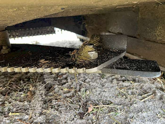 Ein wichtiger Nachteil des Sichelmessers verglichen mit pendelnd aufgehängten Schlegeln darf aber nicht außer Acht gelassen werden: Es ist wesentlich anfälliger gegenüber Fremdkörpern, wie zum Beispiel Grenzsteinen. Teilweise egalisiert wird das beim Thunder 85 C aber dadurch, dass das Sichelmesser aus einem massiv ausgeführten, gezahnten festen Teil sowie beweglichen Spitzen besteht. Wir haben damit ein zölliges Wasserrohr – auch das ist eine beliebte Markierung für Grenzen – erwischt, das sauber, ohne Spuren am Messer zu hinterlassen, durchtrennt wurde.