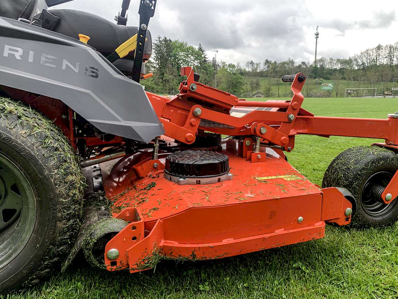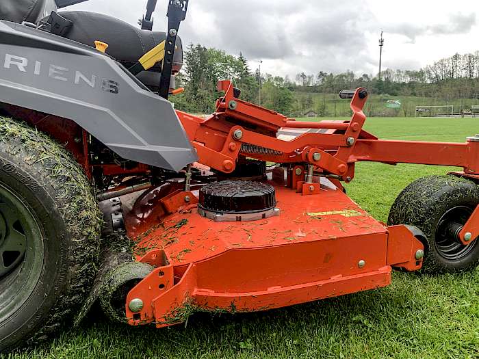 Den Antrieb der Messer übernehmen hier drei Elektromotoren mit je 3.500 W. Das ist eine ganze Menge. Auch hier ist wieder eine Kupplung eingebaut, falls es zu Fremdkörperkontakt kommen sollte. Erhältlich sind drei Breiten: 48‘‘, 52‘‘ und 60‘‘ (122 cm, 132 cm und 152 cm) als Heckauswerfer sowie als Seitenauswerfer. Für letzteres ist noch ein Mulchkit erhältlich. Unsere Testmaschine hatte das 60‘‘-Heckauswurf-Deck. Das ist eine gute Wahl, denn das Mähgut wird gleichmäßig verteilt und auch schon ordentlich zerkleinert. Außerdem passt die Breite sehr gut zu den Außenmaßen des Grundgerätes. Hindernisse können sehr gut umfahren werden. Und die Leistung passt auf jeden Fall. Wir waren mit dem Zenith E sowohl auf einem Sportplatz unterwegs, wo wir 7 cm hohes Gras auf 4,5 cm gekürzt haben. Dabei war ein beachtliches Tempo möglich, das nur knapp unter der Höchstgeschwindigkeit von 17 km/h lag.