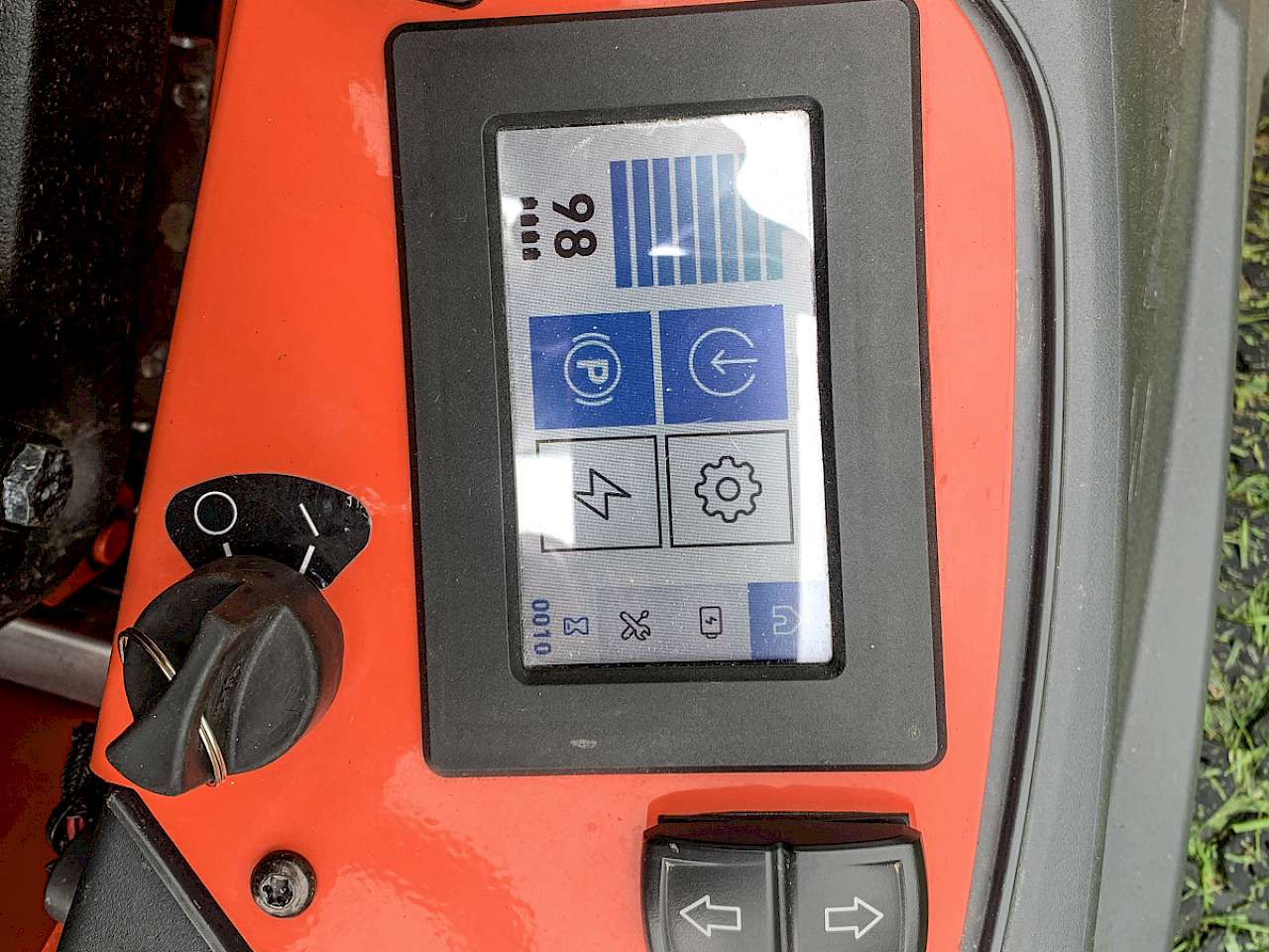 Gelenkt wird mit zwei Zero-Turn-typischen Hebeln. Rechts vom Fahrer gibt es ein Display mit den wichtigsten Informationen, wie dem Ladestand der Akkus. Die Höhenverstellung in 15 Stufen ist simpel und gut visualisiert – über einen Pin in einem Lochbild. Die Angabe war wohl ursprünglich in Zoll und ist deshalb nicht in vollen cm. Die Rasterung bewegt sich zwischen 6 und 8 mm, was völlig reicht. Hoch- und runtergelassen wird das Deck über einen Fußhebel.