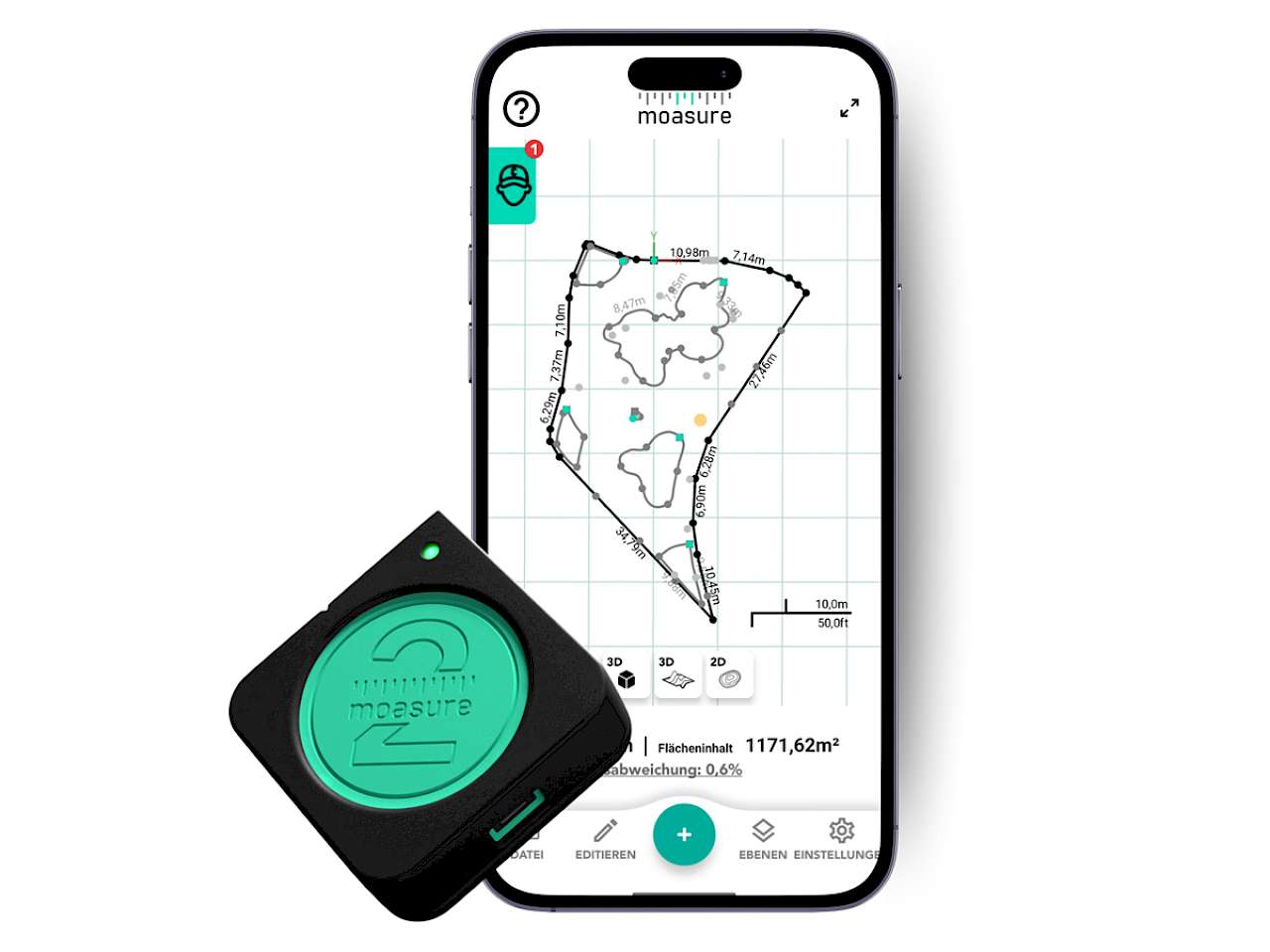 Moasure 2 PRO erfasst komplexe, unregelmäßige X-, Y- und Z-Daten, während es von einem Punkt zum anderen bewegt wird und berechnet automatisch Umfang, Fläche, Höhe, Volumen und so vieles mehr. Auch Bestandspläne können eingemessen werden. Moasure 2 PRO verbindet sich über Bluetooth mit der App und wandelt die Messungen in dynamische Grafiken um. Sie können bearbeitet, gespeichert und über diverse Dateiformate unmittelbar in Ihre CAD-Software exportiert werden.