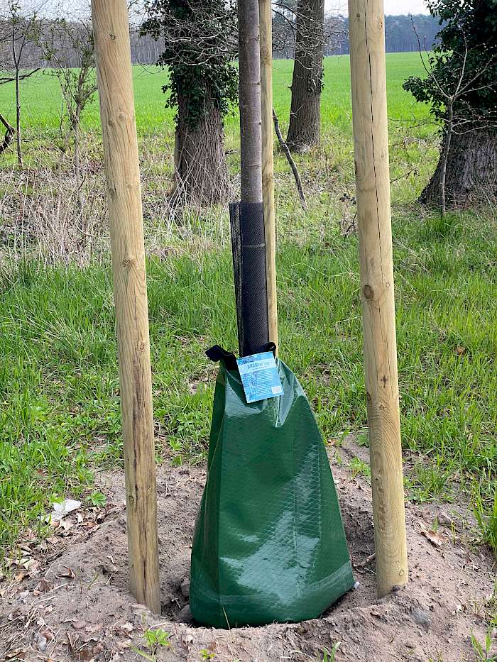 Der Gießring ist weit verbreitet. Aus schlagzähem, wetterfestem Kunststoff sorgt er dafür, dass das Wasser nicht abfließt, sondern zielgerichtet in den Boden einsickert. Zusätzlich bietet er Schutz vor seitlichen Mähschäden. Bewässerungssäcke sind eine Alternative. Die grünen Säcke mit 75 bis 100 l Volumen werden um den Stamm gelegt und befestigt. Über Tropflöcher im Boden geben sie ihren Inhalt innerhalb von 5 bis 7 h in den Untergrund ab. Für größere Stammumfänge können mehrere Säcke miteinander verbunden werden.