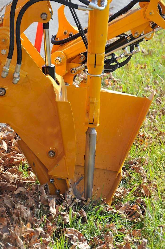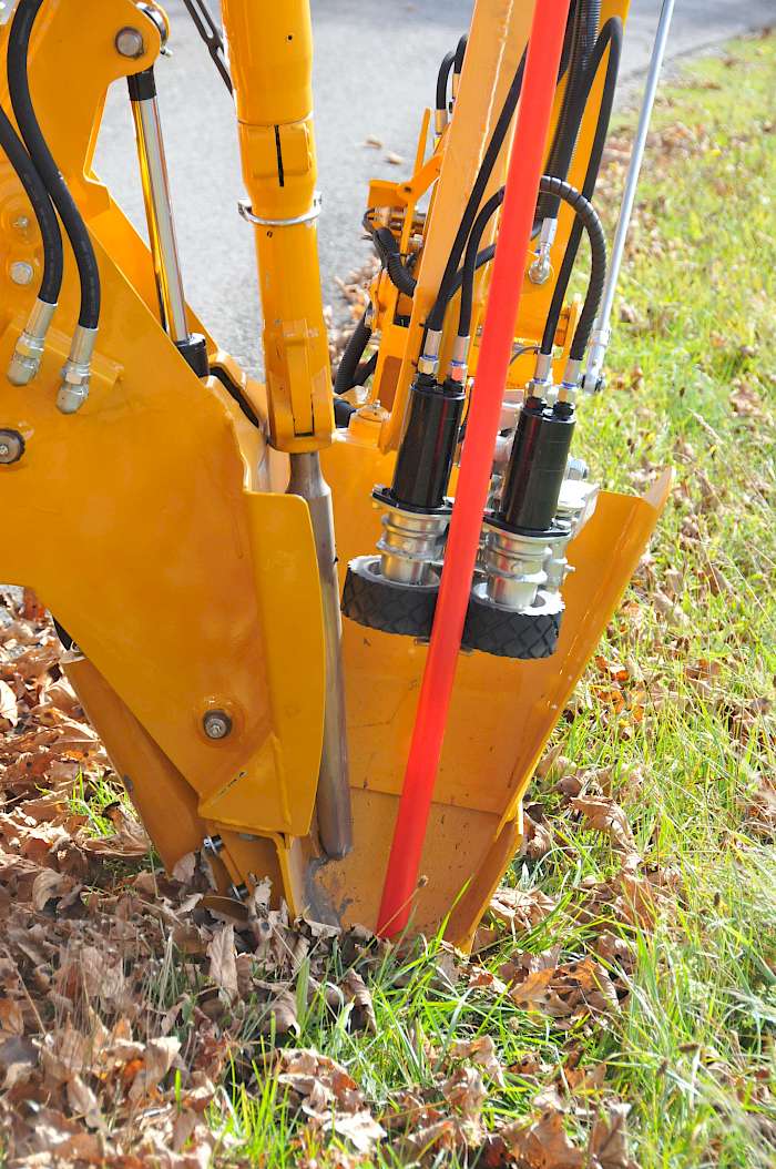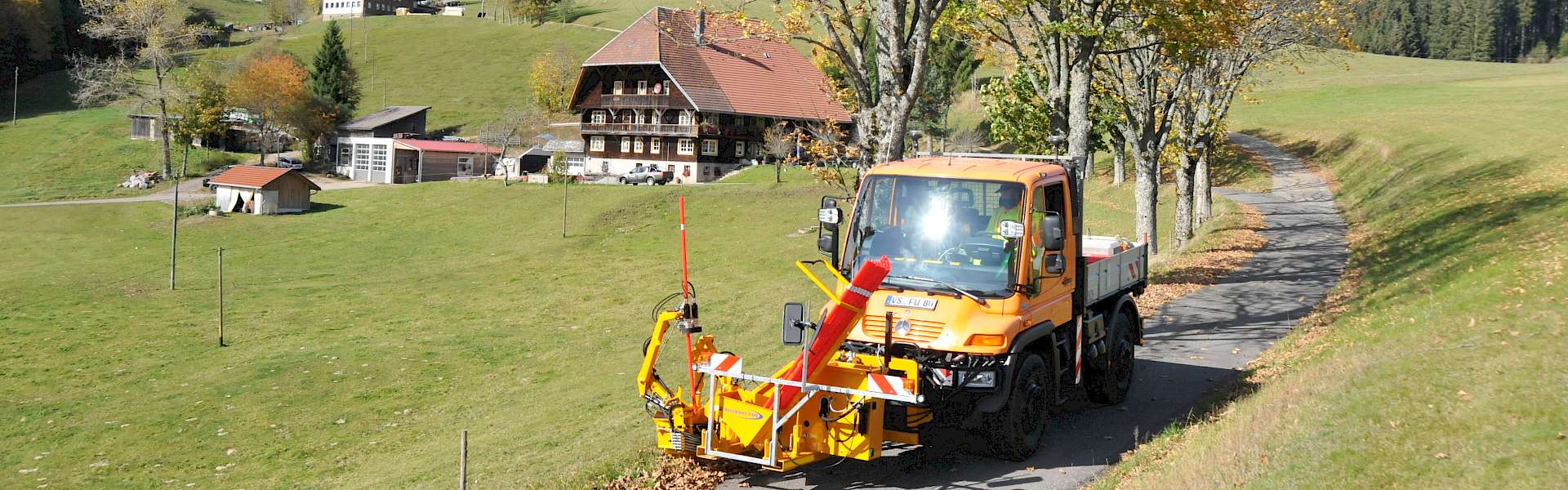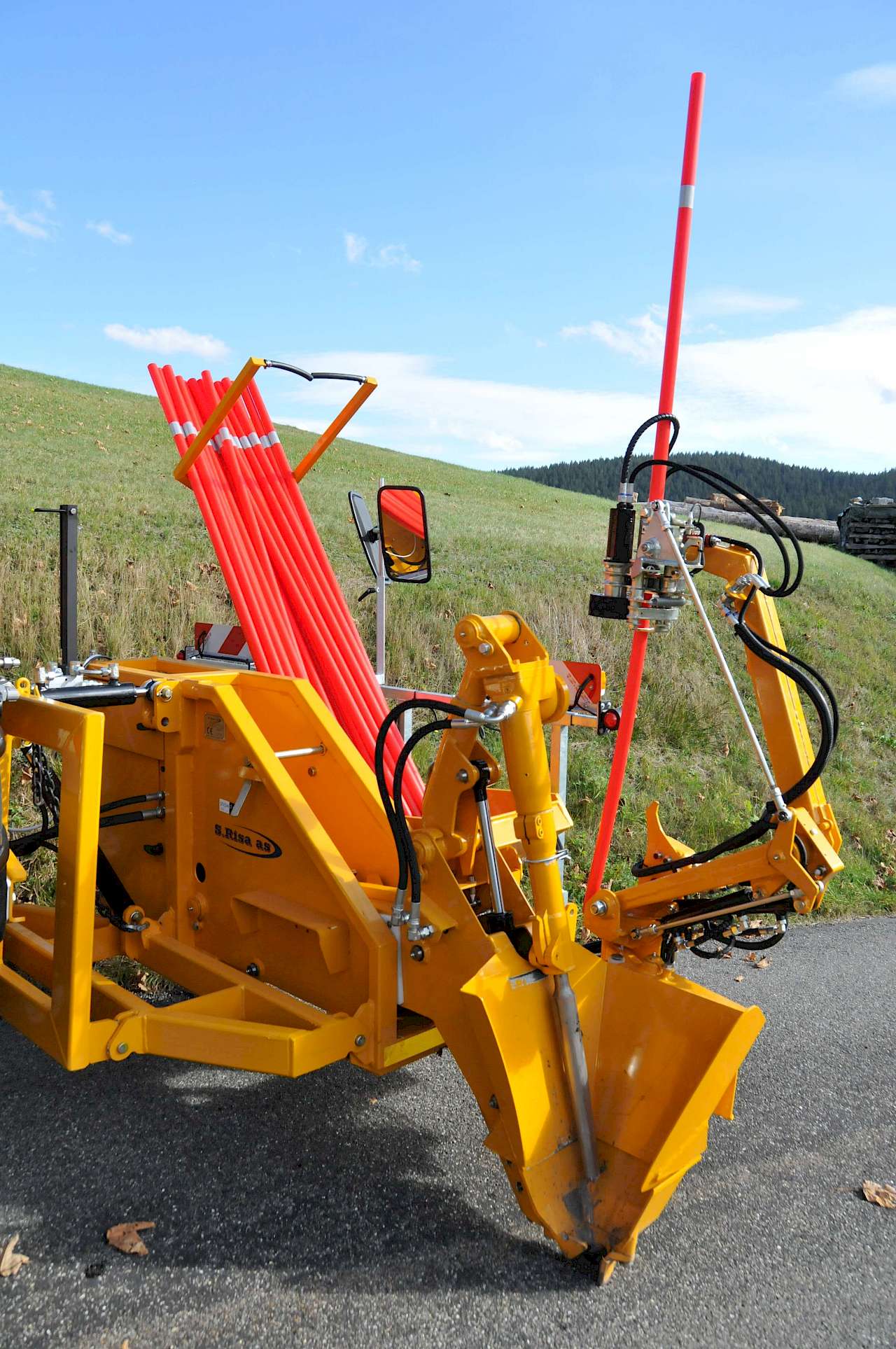 Das Schneestangensetzgerät sieht ein bisschen abstrakt aus, mit seinem Tragekorb für die Schneestangen, dem Vorbau mit rot-weißen Schrägstreifen, die ihn als Kommunalfahrzeug ausweisen, dem ausladenden Stangensetzgerät und dem Greifarm wirkt es geradezu futuristisch. Die Hydraulikschläuche mit Gestänge und Mechanik verleihen ihm etwas roboterhaftes. Das Gerät mit dem Namen „Stickset 500“ wird von der Firma S. Risa im norwegischen Undheim südwestlich von Oslo gebaut. In unseren Breiten vertreibt es die snowstick GmbH im kleinen Ort Gurmels im Kanton Fribourg, und die Technischen Dienste Furtwangen waren einer der ersten Kunden in Deutschland.