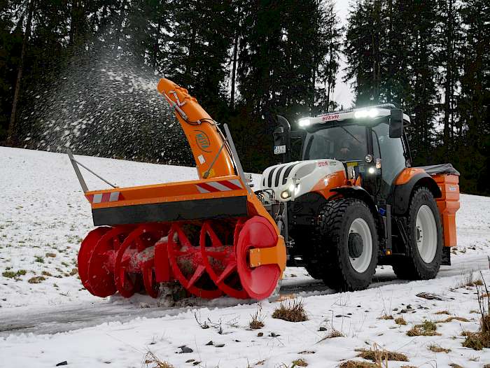 In den vergangenen Jahren sei die Leistung des Räumfahrzeuges in der Gemeinde Grünenbach immer wichtiger geworden; so wie der Fahrer der Maschinen, Hans Aichele, berichtete. Er habe es vermehrt mit nassem und schwerem Schnee, statt nur mit leichtem Pulverschnee zu tun gehabt. Gleichzeitig seien die Straßen immer enger geworden, sodass neben Leistung auch eine kompakte Bauweise des Räumfahrzeuges vermehrt wichtiger geworden sei. „Genau das bringt unser neuer Traktor jetzt mit sich“, sagt Aichele. „Die bisherigen Geräte stießen sonst in den höheren Lagen von Grünenbach oft an ihre Grenzen“, berichtet er. Sechs Zylinder, 145 PS FPT Industrial Motor, Kommunalausrüstung des Steyr Profi 6145 CVT und starke Anbaugeräte schaffen laut ihm jetzt Abhilfe. Der werkseitige Kommunalrahmen an der Front des Traktors bietet die einheitliche Schnittstelle für die diversen Anbaugeräte zur optimalen Kraftaufnahme und Gewichtsverteilung.