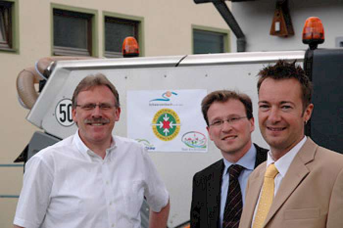 Die drei Bürgermeister Thomas Schwarz, Alexander Eberl und Stefan Breuer freuen sich über die gemeinsame Kehrmaschinenanschaffung. Als Sinnbild für die erfolgreiche Zusammenarbeit soll das Logo der Zeitschrift KommunalTechnik "Interkommunale Zusammenarbeit" und die Logos der Gemeinden dienen, das an beiden Seiten aufgeklebt wurde.