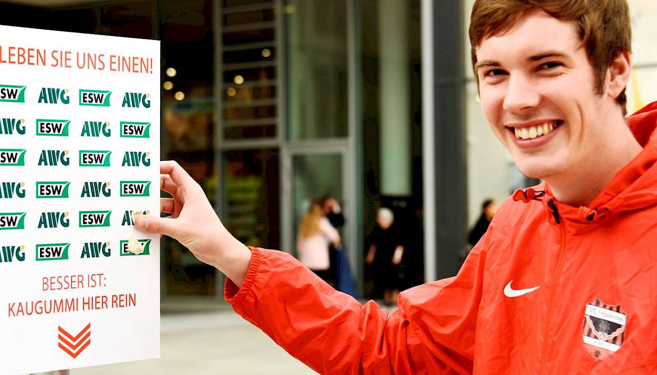 Die Wuppertaler Gum-Wall ist eine DIN A3 große Tafel, die über einem städtischen Papierkorb montiert ist. Auf die Tafel lässt sich eine frei gestaltbare Folie kleben. Für den Start der Kaugummi-Kampagne am Wuppertaler Döppersberg wählten ESW und AWG den griffigen Slogan: "Kleben Sie uns einen". Mit einem Pfeil nach unten in Richtung Abfalleimer weist die Gum-Wall-Folie den Königsweg der Entsorgung: Kaugummis gehören in den Abfalleimer.