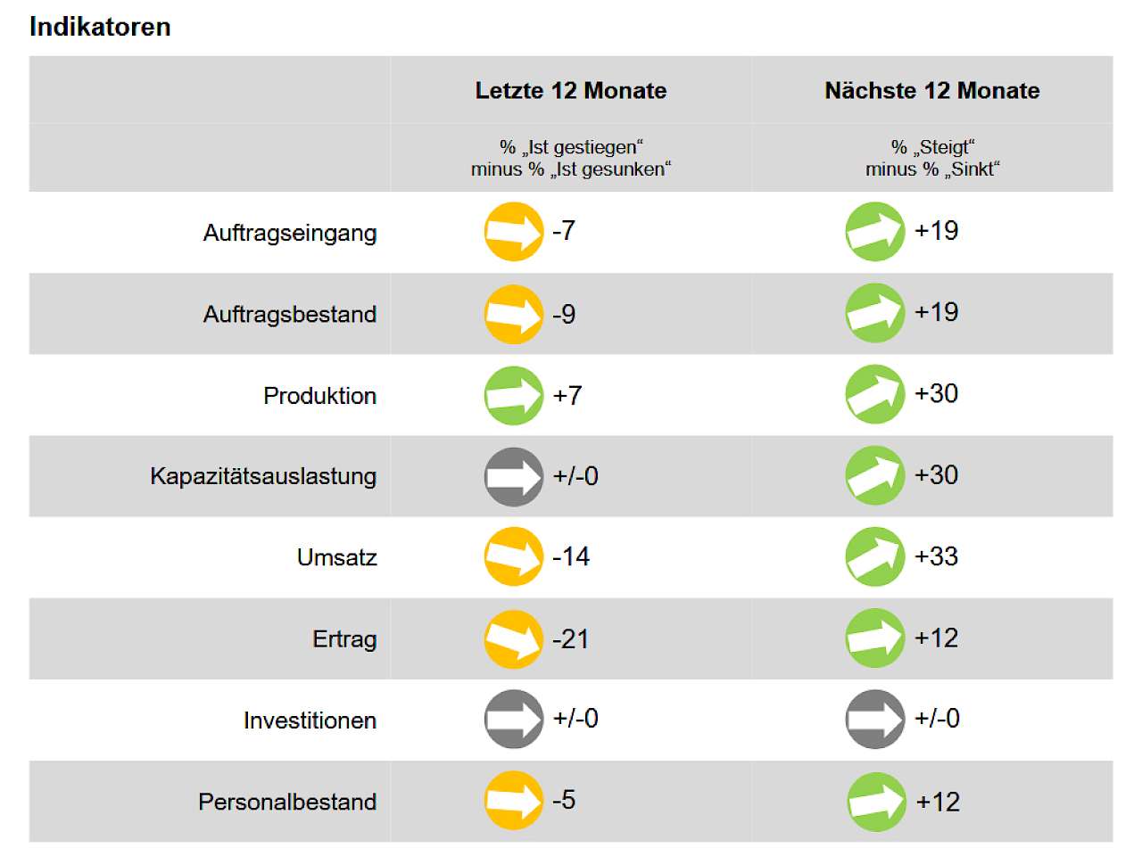 Diese Zukunftsaussichten spiegeln sich in den Erwartungen für die nächsten zwölf Monate in Bezug auf Auftragseingang (+15 %), Auftragsbestand (+20 %), Produktion (+29 %) sowie Kapazitätsauslastung (+32 %). Entsprechend erwarten die Unternehmen für die nächsten zwölf Monate einen steigenden Umsatz (+32 %) und Ertrag (+10 %). Bemerkenswert sind die Aussichten beim Personalbestand: Entgegen dem allgemeinen Wirtschaftstrend soll der Personalbestand zunehmen (+10 %). Die Arbeitsgeräte- und Kommunalfahrzeug-Industrie ist damit eine der wenigen Branchen, die mit Personalzuwachs rechnen.