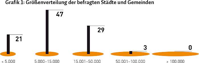 Jeder Baubetriebshof hat - unabhängig von seiner Größe - diverse Fahrzeuge. Je größer der Betrieb, desto umfangreicher ist naturgemäß auch der Fuhrpark. Aber was „leisten“ sich speziell die kleineren und mittleren Gemeinden? Welche Arbeiten führen sie selbst durch? Und wofür nutzen sie Dienstleister, seien es nun größere Baubetriebshöfe aus Nachbargemeinden oder private Anbieter? Das wollten wir genauer wissen und haben uns bei der Auswahl der 100 Teilnehmer des KT Trend-Report zum Thema Fahrzeugtechnik bewusst auf Gemeinden und Städte unterhalb der Grenze von 100.000 Einwohnern konzentriert. Dies umso mehr, da rund 90 % der Städte und Gemeinden in Deutschland weniger als 20.000 Einwohner haben. Die Aufteilung unserer Umfrageteilnehmer nach Größen gibt Grafik 1 wieder.