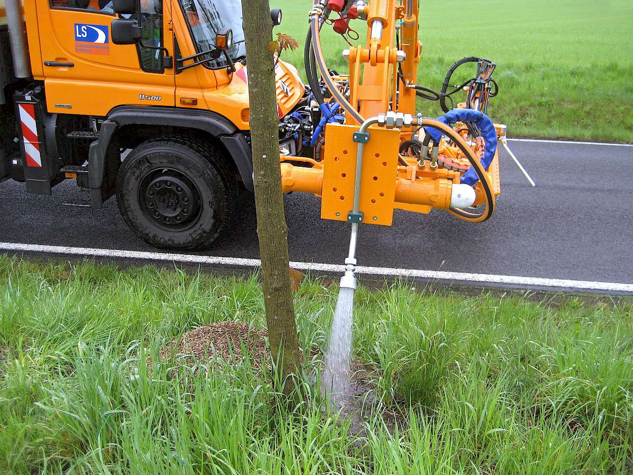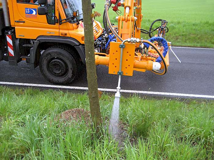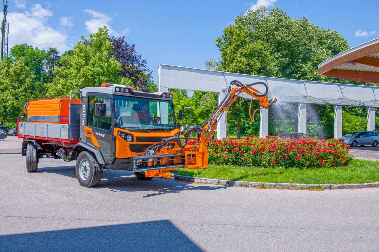 Der Markt wächst mit seinen Herausforderungen! Das gilt ganz besonders für den Bereich Gießtechnik. Bis vor einigen Jahren wurden vielfach DIY-Lösungen für den Gießeinsatz genutzt. Die bestanden in aller Regel aus einem Wasserfass oder einem IBC-Container, einer Pumpe sowie einem Wasserschlauch. Der Gießprozess gestaltete sich entsprechend aufwendig: Heranfahren an den Baum oder Pflanzenkübel, Fahrzeug verlassen und den Wasserschlauchabrollen und manuell gießen. Der Zeitaufwand für dieses Gießkonzept ist hoch und vor dem Hintergrund wachsender Anforderungen an die Baumbewässerung eigentlich nicht wirtschaftlich darstellbar. Deutlich effizienter lassen sich Bewässerungsprozesse mit Hilfe spezieller Gießarme realisieren. Gießarme sind vom Fahrerhaus aus hydraulisch oder elektrisch steuerbare Ausleger mit einem Gießkopf. Die Wasserversorgung erfolgt über einen mitgeführten Wassertank, von dem aus das Wasser über ein Leitungssystem an den Gießkopf geführt wird. Wichtigster Vorteil dieses Konzeptes: Die Mitarbeiter müssen das Fahrzeug für den Gießvorgang nicht mehr verlassen. Das führt zu einer deutlichen Zeitersparnis pro Gießvorgang.