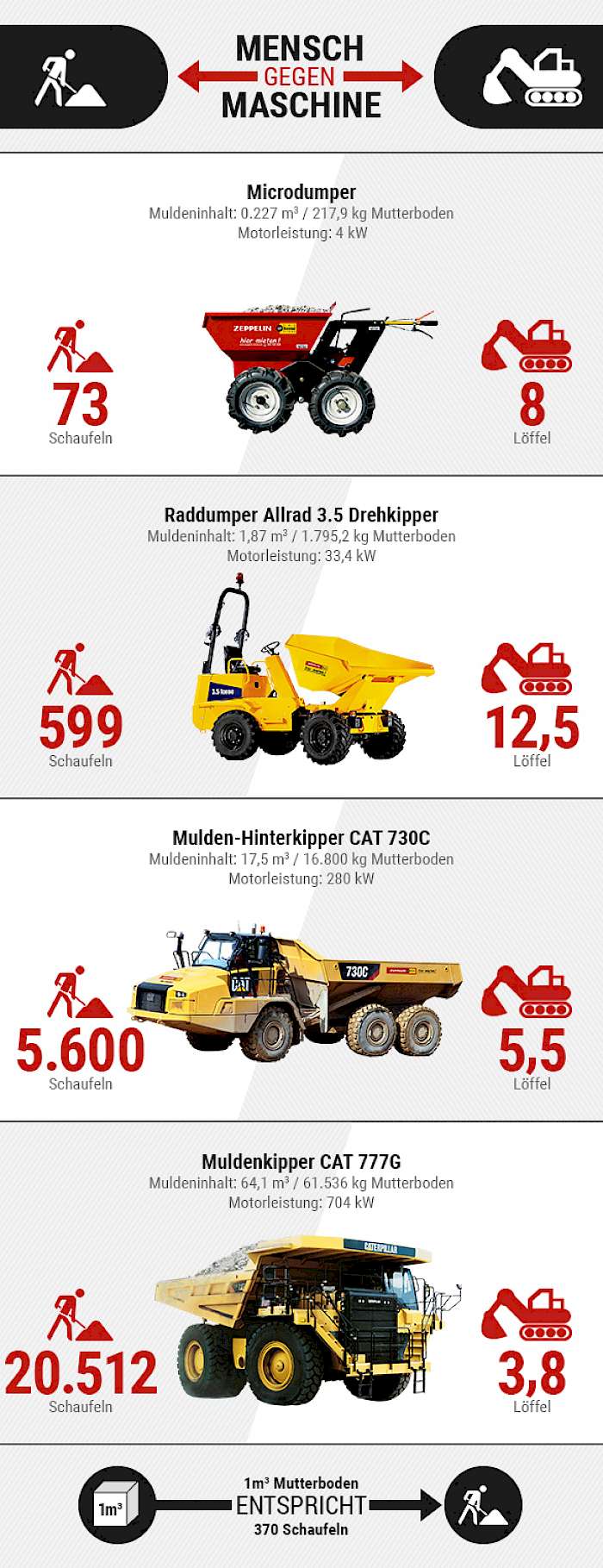 Vier Bagger unterschiedlicher Größe wurden in einen fiktiven Wettbewerb mit dem Menschen geschickt. Geschaufelt werden sollte das Material Mutterboden in vier Dumper mit verschiedenen Muldeninhalten. Es wurde davon ausgegangen, dass ein Mensch mit einer Schaufel 3 kg Erde laden kann. Die Höhe des Ausmaßes ist dabei bereits beim kleinsten Bagger des Vergleichs hoch: Dieser kann mit einem gestrichenen Löffel 26 kg Mutterboden laden, also mehr als die achtfache Menge, die ein Mensch mit einer Schaufel schaffen würde. Es handelt es sich um den Minibagger CAT 300.9 D, der wie zwei weitere Bagger und andere Baumaschinen bei Zeppelin Rental gemietet werden kann.