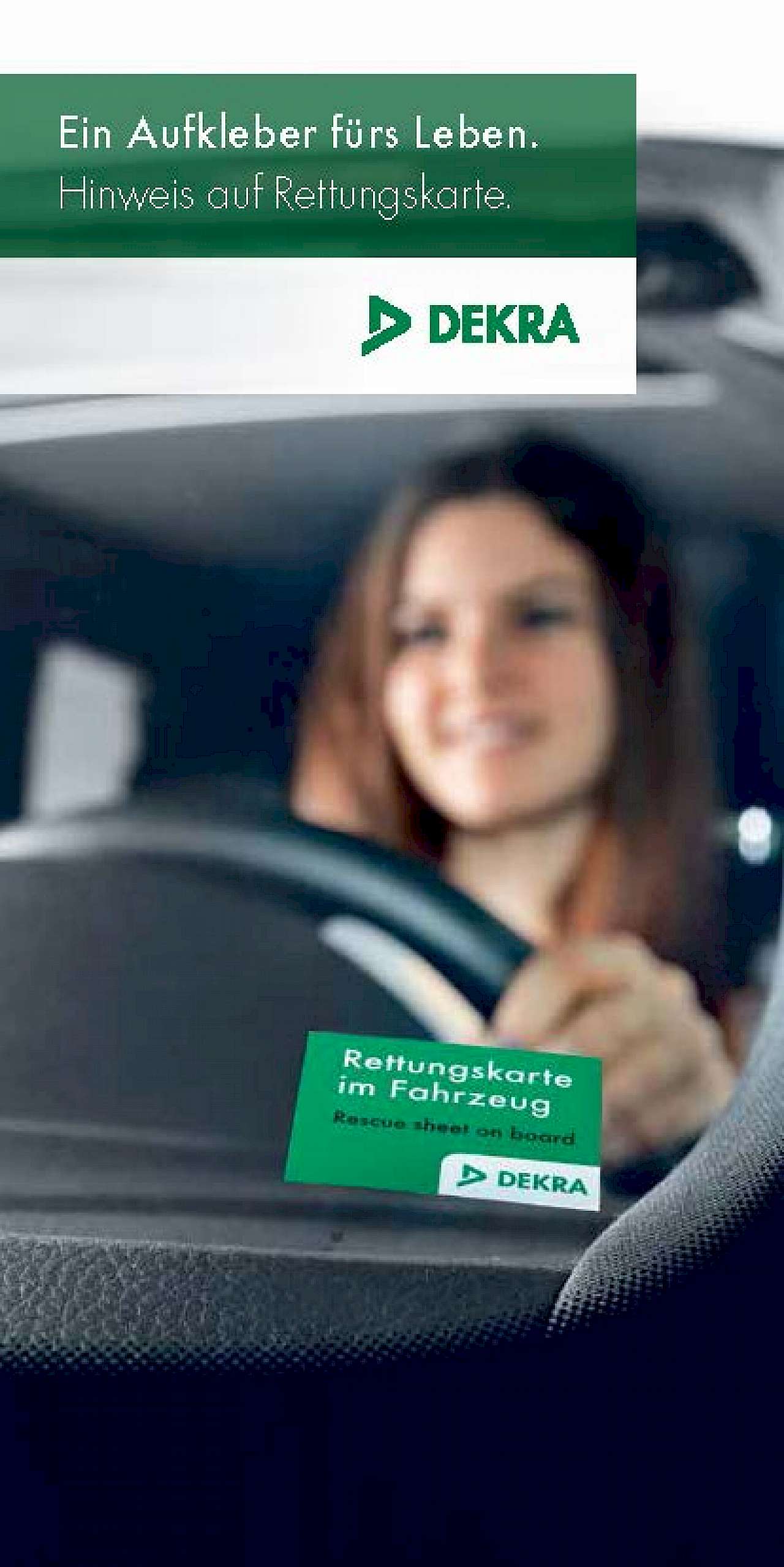 DEKRA trägt mit dem kostenlosen DEKRA Aufkleber „Rettungskarte im Fahrzeug“ nach eigener Angabe zu einer schnelleren und standardisierten Rettung bei und unterstützt die Rettungskräfte bei der Rettung Ihres Lebens.