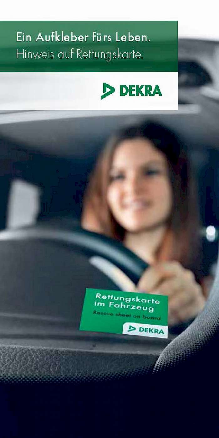 - Aufkleber „Rettungskarte im Fahrzeug“ am linken oberen oder unteren Rand der Windschutzscheibe anbringen. Den DEKRA Aufkleber „Rettungskarte im Fahrzeug" können Sie hier kostenlos anfordern.
