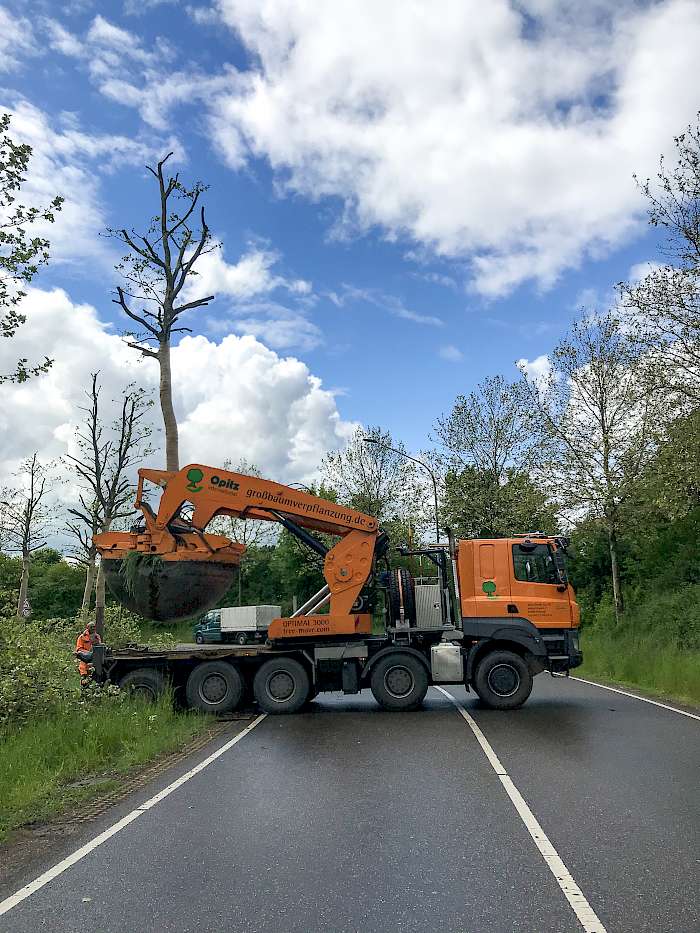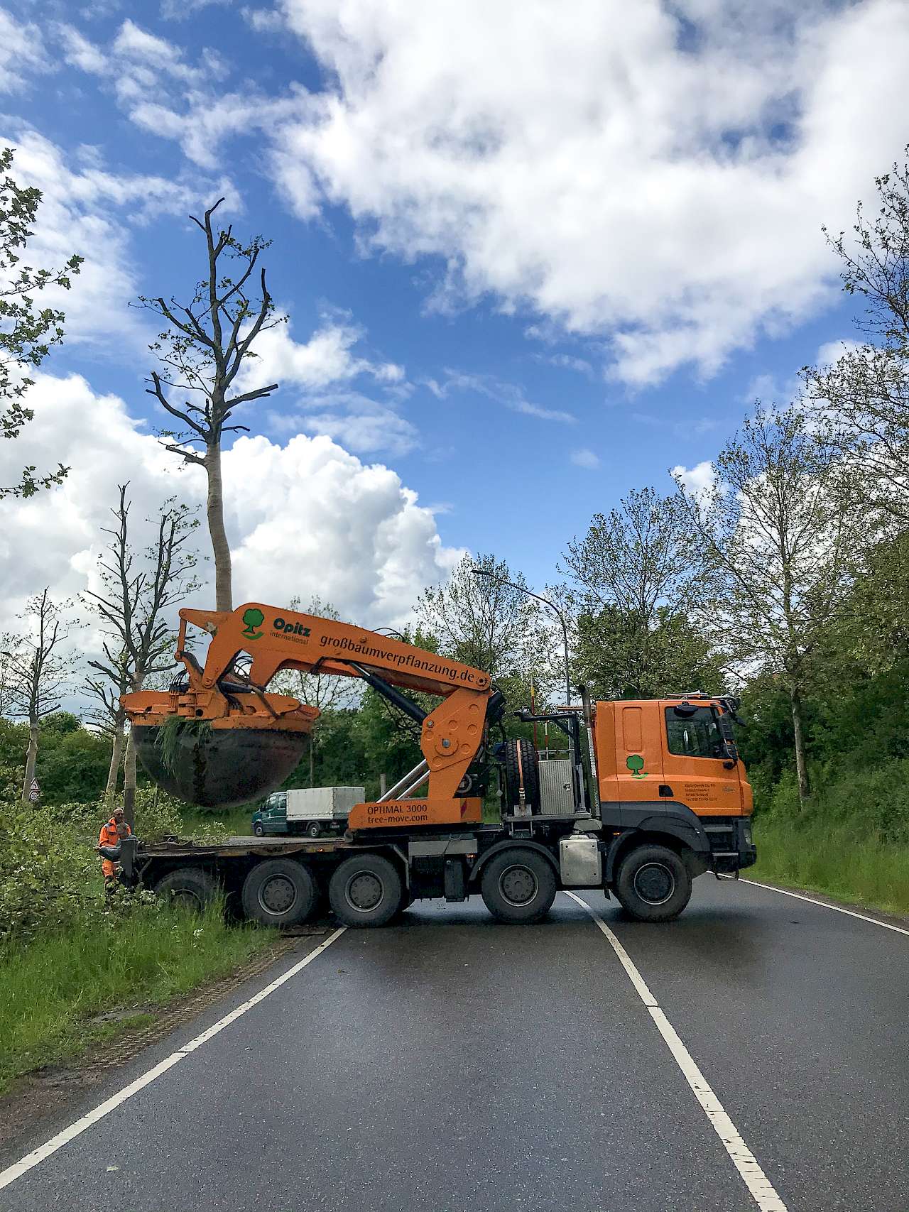 Da auf dem finalen Weg einige Brücken unterquert werden musste, fiel der Rückschnitt der Bäume kräftiger aus als anfangs gedacht – was sich im Nachhinein als eindeutig unproblematisch herausstellte. Dieser Punkt bringt Dietmar Esser zu einem anderen, ihm wichtigen Aspekt: dem Zeitpunkt des Verpflanzens. Landläufig werde Herbst oder Winter als optimaler Pflanzzeitpunkt angesehen. „Wir haben uns jedoch für das Frühjahr, zum Beginn des Blattaustriebs entschieden. Der Vorteil dabei ist, dass der Baum mit einsetzender Vegetation quasi unmittelbar reagieren kann, etwa auf die beim Umsetzen unvermeidlichen Verletzungen und Schnittwunden. Dadurch kann er sich gegen eventuellen Pilzbefall besser wehren als in der Winterruhe, die Wundheilung setzt also unmittelbar ein “, so die Erklärung.