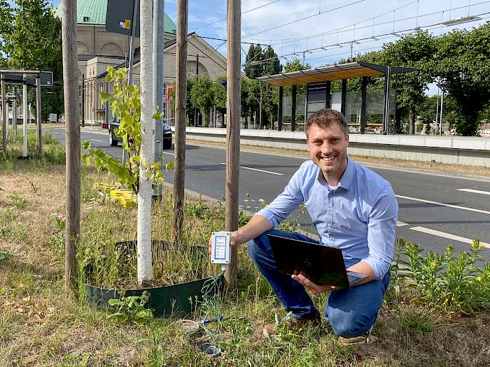 Gleichzeitig ergab sich für die Stadt die Möglichkeit, am EIP-Projekt „NuTree“ teilzunehmen, bei dem die Verwendung von Sensortechnik im Fokus steht. „Zur Projektbearbeitung und als Experte für Sensortechnik konnten wir Jan Pinski gewinnen. Er ist nun seit gut sechs Monaten bei uns tätig“, freut sich Manuel Kornmayer. „Einen zusätzlichen Schub brachten weitere Mittel des Modernisierungsfonds der Stadt Hannover zu den Themen Digitalisierung und Klimafolgenanpassung. Personell sind wir derzeit bezüglich Bodensensorik sehr gut aufgestellt.“