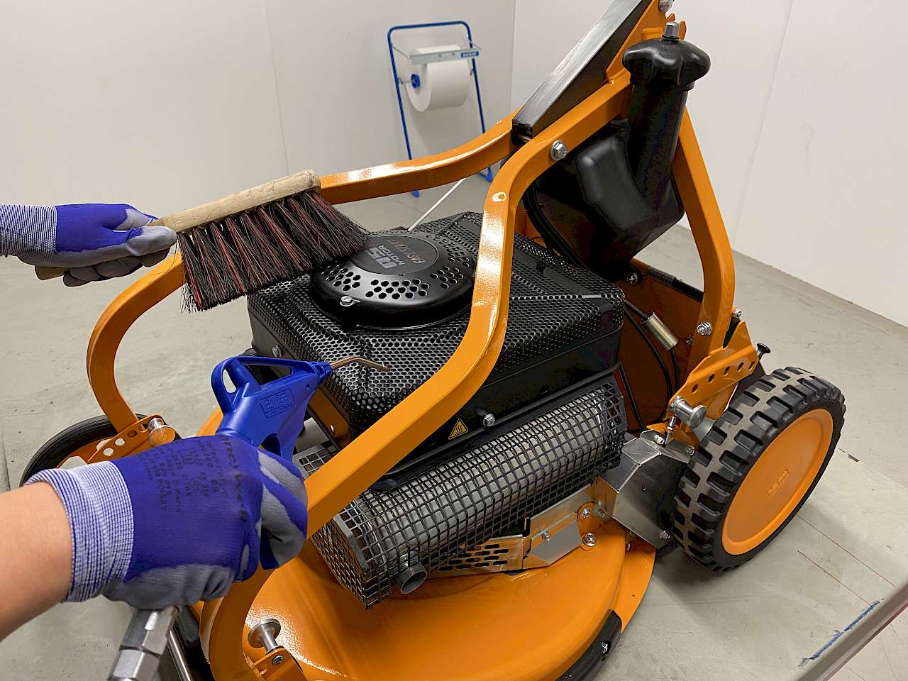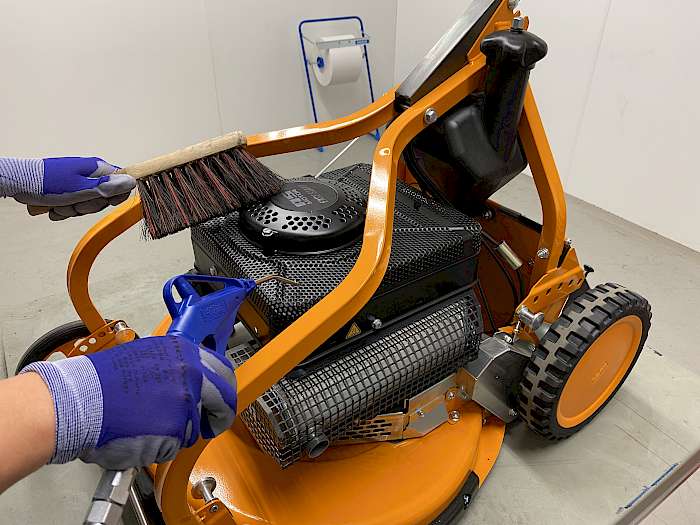 Um die Karosserie und den Rahmen zu reinigen kehrt man zunächst losen Schmutz, Staub, Blätter und Äste mit einem Handbesen ab. Anhaftende Verschmutzungen werden mit einem feuchten Lappen und schonendem Reinigungsmittel entfernt. Der Experte aus dem Hause AS-Motor weißt darauf hin, dass gerade sich zersetzendes, feuchtes Gras und Laub besonders korrosiv zu Metallen und Oberflächen sind. Achten Sie deshalb auf Faulnester in Ecken und Winkeln Ihrer Maschine. Besonders effektiv und schonend lässt sich die Karosserie mit Druckluft reinigen. Vom Gebrauch von Hochdruckreinigern wird dagegen abgeraten. Empfindliche Lager und Bauteile werden entfettet, Wasser dringt ein und Reinigungszusätze sind zudem oftmals besonders korrosiv. Fließendes Wasser aus dem Schlauch kann verwendet werden. Aber bitte auch hierbei empfindliche und elektrische Teile aussparen und keinen direkten Strahl auf Lager richten.
