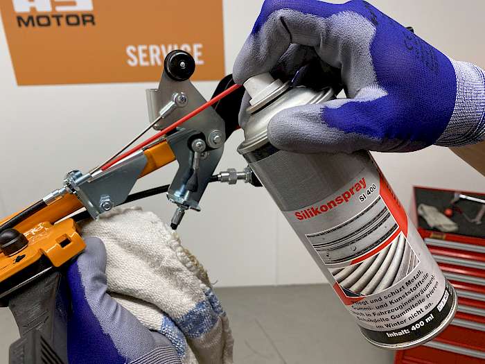 Nach dem Reinigen können nun alle Gelenke, Scharniere und Bedienhebel mit harzfreiem Multifunktions-Öl geschmiert werden. Hierbei ist zu beachten, dass auf Antriebs- oder Keilriemen, Riemenscheiben, Bremsbeläge oder Trocken-kupplungen kein Schmierstoff, Öl oder Wachs gelangen darf.