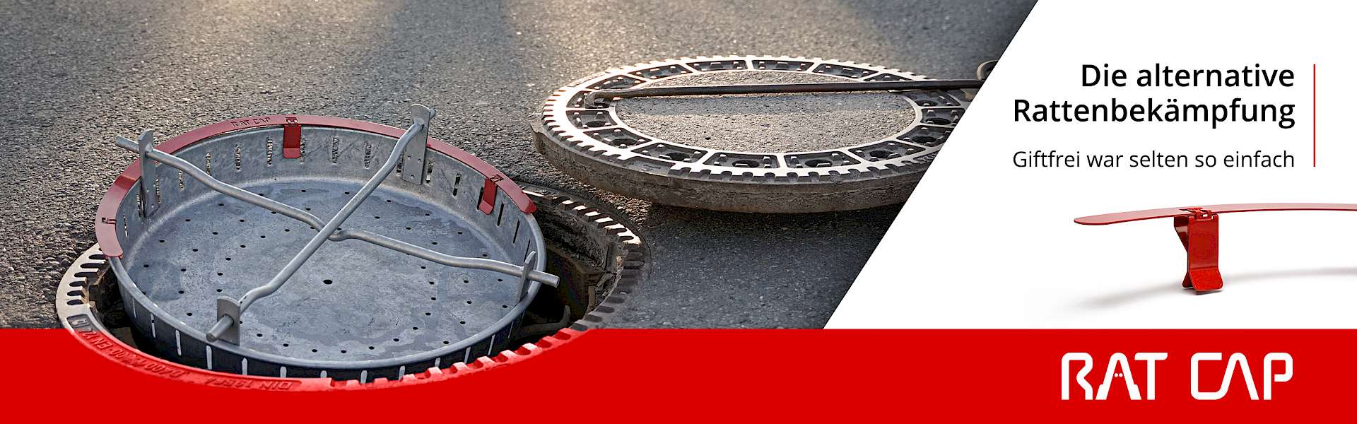 Mit RatCap können Gullis im Handumdrehen nachgerüstet werden und Ratten sofort den Weg in die Kanalisation versperren. Die Vorrichtung wird dazu auf den Schmutzfangkorb in einem Gulli aufgesteckt und dichtet so den Spalt zwischen diesem Schmutzfangkorb und dem Kanalschacht ab. So schaffen es Ratten, die sich in der Kanalisation befinden, nicht mehr heraus; und Ratten, die über der Erde sind, kommen nicht mehr rein.
