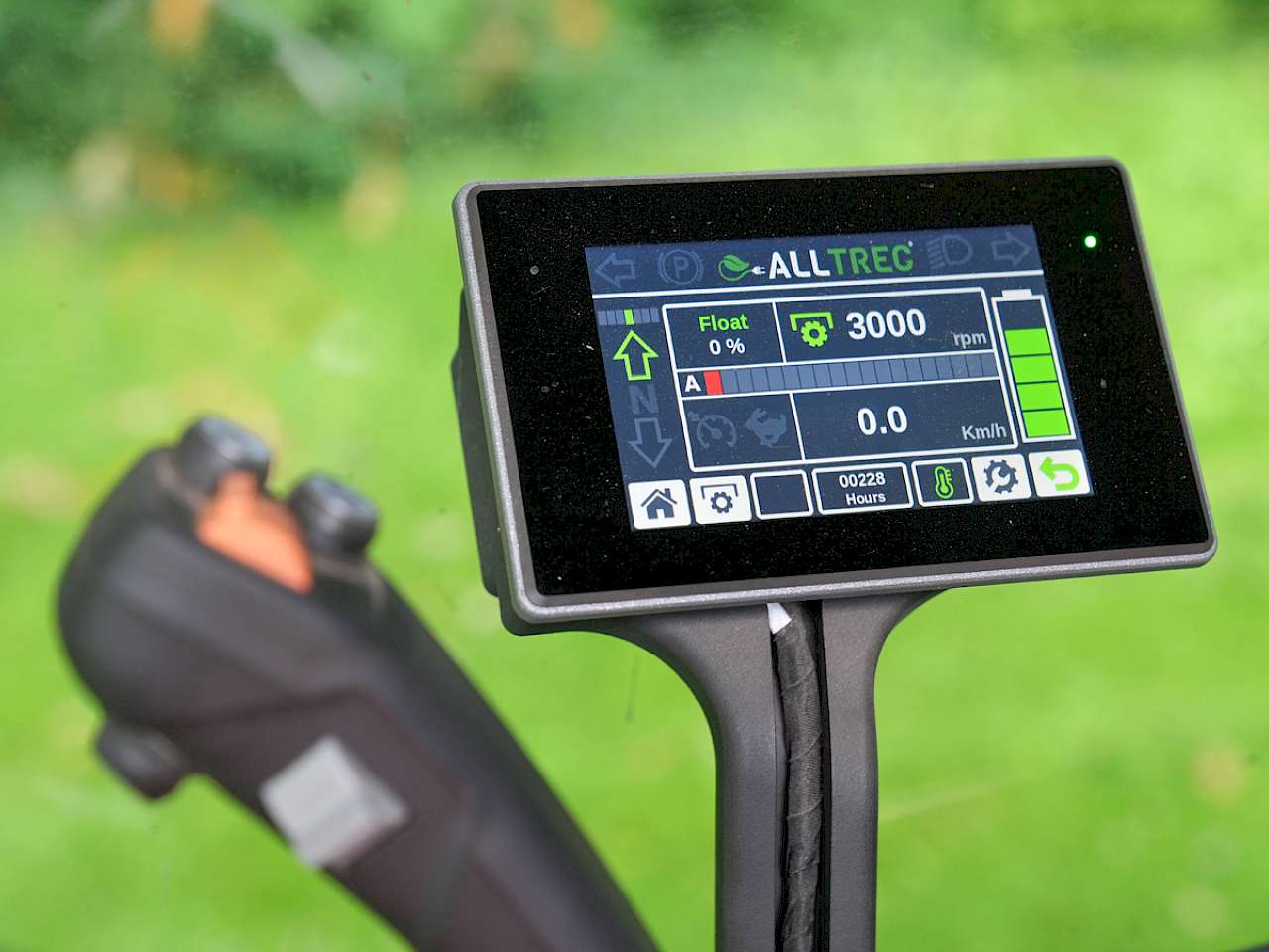 Der Geräteträger selbst, ein AllTrec 8015F des niederländischen Herstellers FPS-Electric B.V, verfügt über einen Elektroantrieb für alle Fahr- und Mähfunktionen. René Lohaus macht sich an die Arbeit. Die zahlreichen Rasenflächen in seinem Bezirk müssen jetzt in der Wachstumsperiode im 3-Wochen-Rhythmus gemäht werden.
