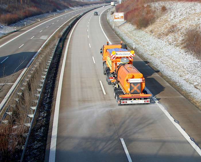 Salz bedeutet in diesem Zusammenhang aber nicht „trockenes“ Material, sondern grundsätzlich Feuchtsalz, also entweder FS 30 oder FS 100, also Sole. Letztere hat dabei allerdings eindeutig den Vorrang, wie Herbert Wagenländer hervorhebt. Seit 2013 setzt die Autobahnmeisterei Neusitz Sole ein und hat damit im Regelbetrieb viele Erfahrungen sammeln können. Vorteil eins ist für ihn die absolut gleichmäßige Ausbringung und Verteilung auf der Fahrbahn. Auch FS 30 biete dafür schon eine relativ gute Gewähr, wobei die Erfahrung jedoch zeige, dass in der Praxis besonders die Verteilung durch Verwirbelung nachfolgender Fahrzeuge doch nicht immer optimal sei. Und aus der besseren Haftung der Sole auf der Fahrbahn ergibt sich für Herbert Wagenländer Vorteil zwei: höhere Fahrgeschwindigkeiten bei der Ausbringung.
