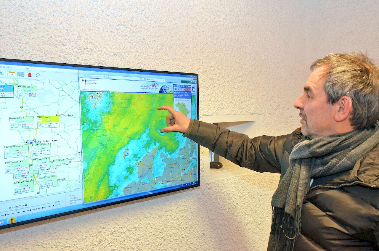 Vor diesem Hintergrund sind Wetter- und Glätteprognosen ein sehr wichtiges Mittel der Prävention. Dies fällt dem Besucher der Autobahnmeisterei schon im Eingangsbereich des Verwaltungsgebäudes auf. Dort hängt ein großer 43-Zoll-Monitor, der permanent die aktuellen Wetterkarten und Verlaufsfilme des Wetterradars zeigt, ebenso wie die Messergebnisse der an mehreren Brücken installierten Sensoren und Wetterstationen. Im Bezirk Neusitz gibt es davon zwei, außerdem können Daten der benachbarten Meistereien abgefragt werden. So stehen Informationen über die relative Luftfeuchtigkeit, Temperatur von Luft und Fahrbahn sowie die Niederschläge zur Verfügung, anhand derer eine zu erwartende Glättebildung mit zwei bis fünf Stunden Vorlauf abgeschätzt werden kann, so der Dienststellenleiter. „Das ist sehr hilfreich, ersetzt allerdings nicht die persönliche Überprüfung durch unsere Kollegen des Bereitschaftsdienstes. Immerhin beträgt der Höhenunterschied zwischen Marktbreit und Feuchtwangen etwa 320 m, da kann die Glätte an sehr unterschiedlichen Punkten zum Problem werden, vor allem in der Übergangszeit im Herbst und Frühjahr. Insgesamt gilt deshalb für uns: Vorbeugen ist für uns das A und O. Und bevor die erste Flocke oder der erste Tropfen Regen auf gefrorenen Boden fällt, muss das Salz auf der Straße liegen. Denn ist der Stau erst einmal da, hat auch der Winterdienst keine Chance mehr.“