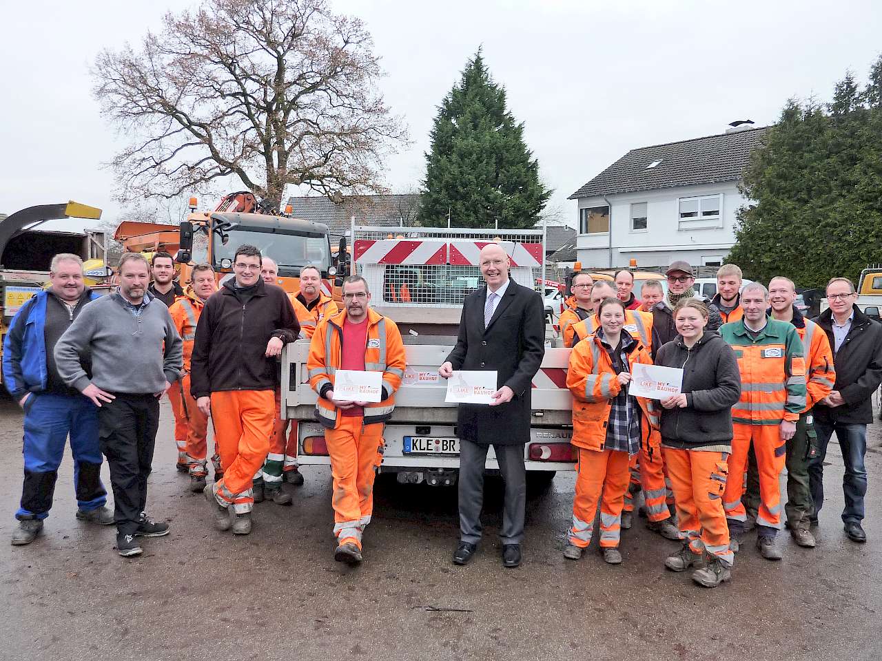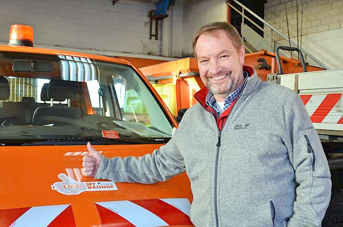 Ganz im Sinne des Wettbewerbs, die Imagearbeit der Baubetriebshöfe zu fördern, war für ihn glasklar, in den Tagen nach der Preisverleihung Aufkleber in verschiedenen Größen vom Logo des KT-Image-Award, dem Daumen mit dem Slogan „I like my Bauhof“, anfertigen zu lassen und diese an allen Fahrzeugen des Bauhof-Fuhrparks anzubringen. Dies natürlich öffentlichkeitswirksam, gemeinsam mit den Mitarbeitern und der Presseabteilung der Stadt Rees, die daraus postwendend eine Pressemitteilung verschickte. „Für uns war die Aufkleberaktion ein besonderer Tag, und wir wurden hinterher von vielen Seiten darauf angesprochen“, erzählt er und fügt dann noch mit einem Augenzwinkern hinzu: „Eine ältere Dame aus der Nachbarschaft fragte sogar an, ob es davon auch einen kleinen Aufkleber gäbe, den sie auf ihren Rollator kleben könne. Denn sie findet unsere Arbeit und die Aufkleber so prima. Das zeigt mir, wie gut unser Team mit den Einwohnern von Rees verbunden ist.“