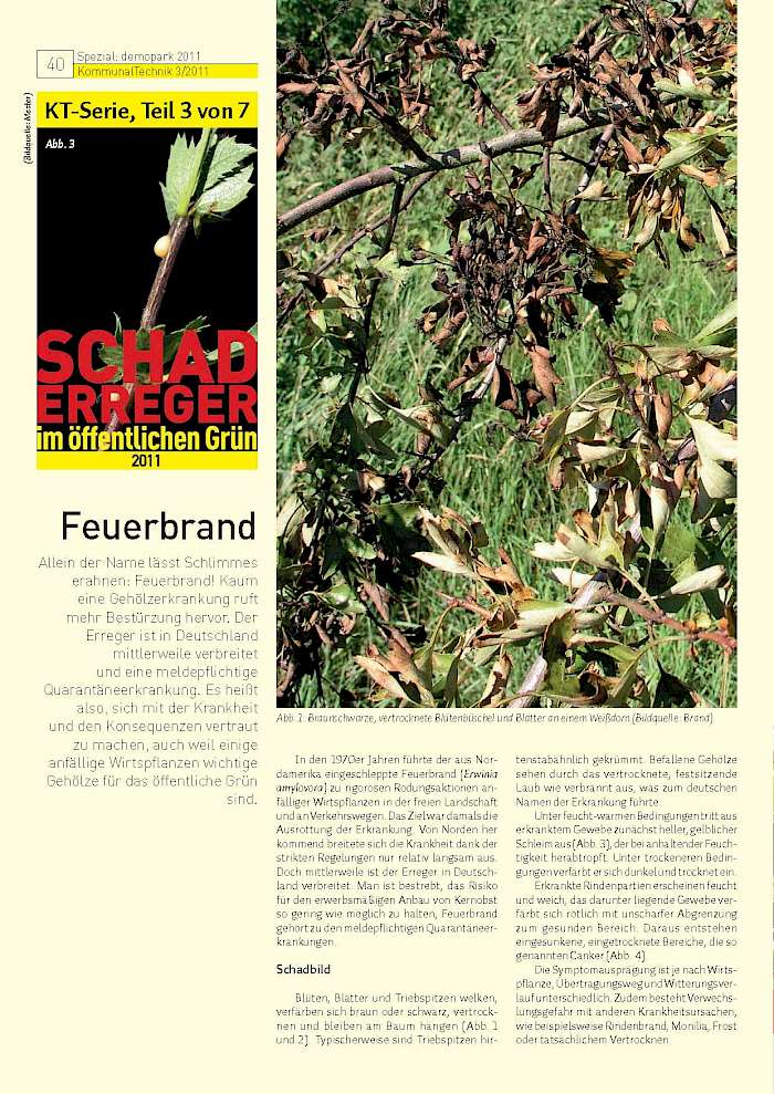 Allein der Name lässt Schlimmes erahnen: Feuerbrand! Kaum eine Gehölzerkrankung ruft mehr Bestürzung hervor. Der Erreger ist in Deutschland mittlerweile verbreitet und eine meldepflichtige Quarantäneerkrankung. Es heißt also, sich mit der Krankheit und den Konsequenzen vertraut zu machen, auch weil einige anfällige Wirtspflanzen wichtige Gehölze für das öffentliche Grün sind.
