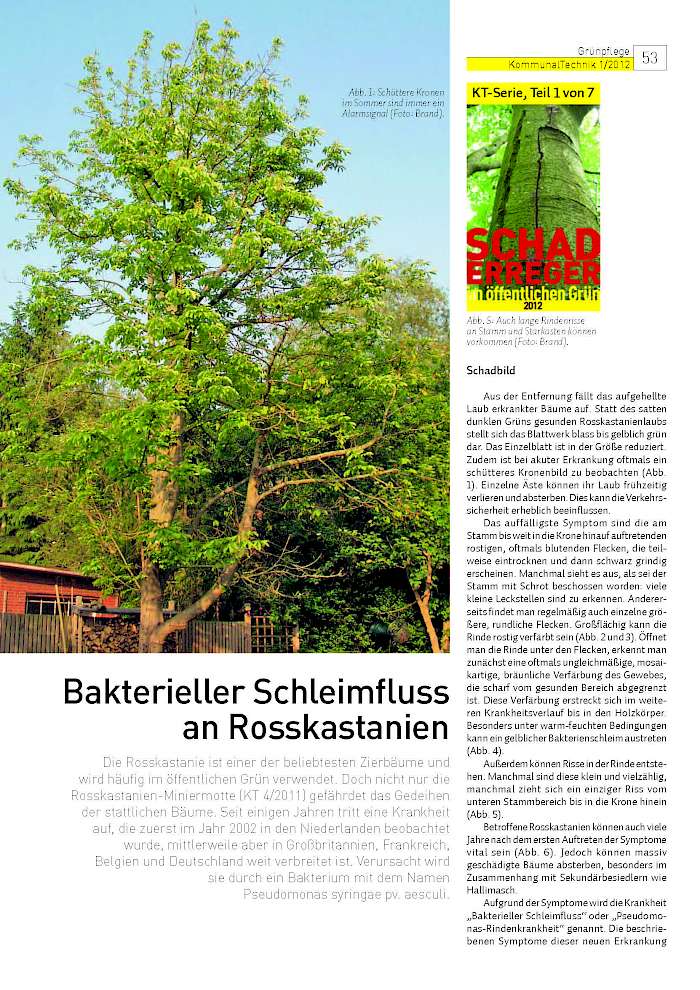 Die Rosskastanie ist einer der beliebtesten Zierbäume und wird häufig im öffentlichen Grün verwendet. Doch nicht nur die Rosskastanien-Miniermotte (KT 4/2011) gefährdet das Gedeihen der stattlichen Bäume. Seit einigen Jahren tritt eine Krankheit auf, die zuerst im Jahr 2002 in den Niederlanden beobachtet wurde, mittlerweile aber in Großbritannien, Frankreich, Belgien und Deutschland weit verbreitet ist. Verursacht wird sie durch ein Bakterium mit dem Namen Pseudomonas syringae pv. aesculi.