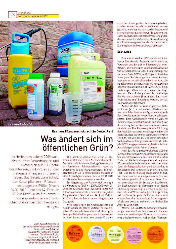 der Kulturpflanzen – Pflanzenschutzgesetz (PflSchG) vom 06.02.2012 – trat am 14. Februar 2012 in Kraft. Auch für kommunale Anwendungen im öffentlichen Grün ändert sich hierdurch einiges.