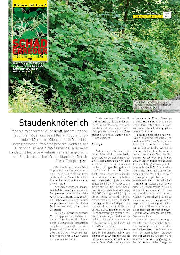 Pflanzen mit enormer Wuchskraft, hohem Regenerationsvermögen und beachtlicher Ausbreitungstendenz können im öffentlichen Grün nicht zu unterschätzende Probleme bereiten. Wenn es sich auch noch um eine nicht-heimische, invasive Art handelt, ist besondere Aufmerksamkeit angebracht. Ein Paradebeispiel hierfür: die Staudenknöterich-Arten (Fallopia spec.).