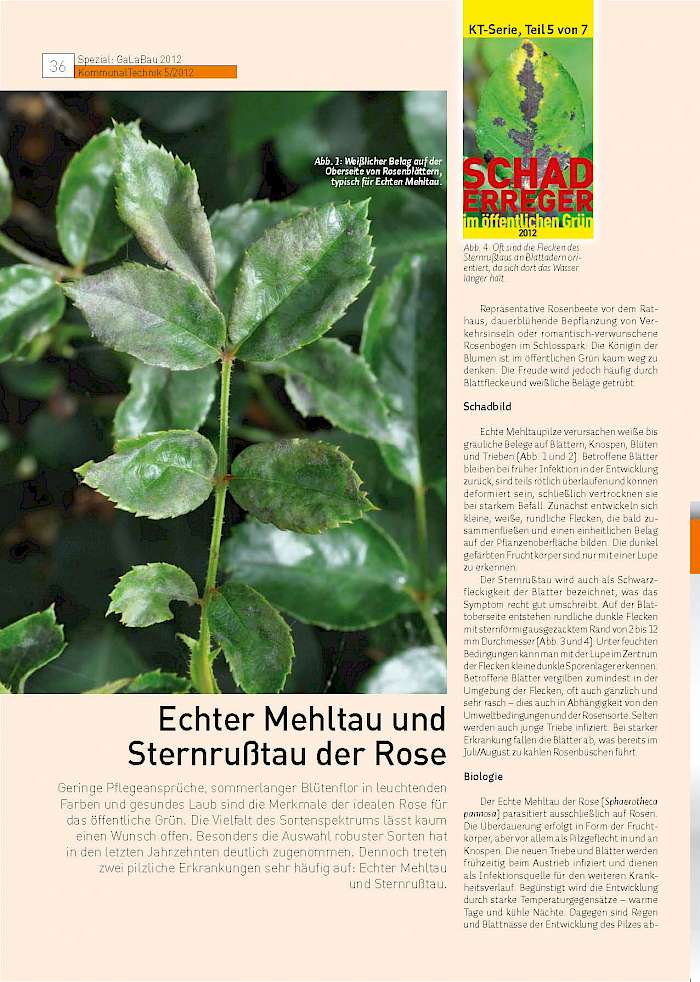 Geringe Pflegeansprüche, sommerlanger Blütenflor in leuchtenden Farben und gesundes Laub sind die Merkmale der idealen Rose für das öffentliche Grün. Die Vielfalt des Sortenspektrums lässt kaum einen Wunsch offen. Besonders die Auswahl robuster Sorten hat in den letzten Jahrzehnten deutlich zugenommen. Dennoch treten zwei pilzliche Erkrankungen sehr häufig auf: Echter Mehltau und Sternrußtau.
