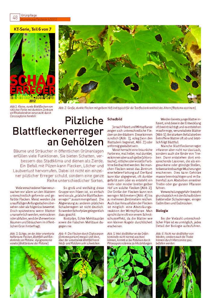 Bäume und Sträucher in öffentlichen Grünanlagen erfüllen viele Funktionen. Sie bieten Schatten, verbessern das Stadtklima und dienen als Zierde. Ein Befall mit Pilzen kann Flecken, Löcher und Laubverlust hervorrufen. Dabei ist nicht ein einzelner pilzlicher Erreger schuld, sondern eine ganze Reihe unterschiedlicher Sorten.