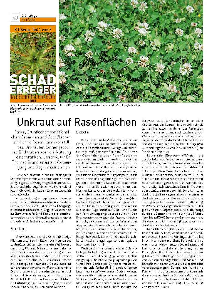 Parks, Grünflächen vor öffentlichen Gebäuden und Sportflächen sind ohne Rasen kaum vorstellbar. Unkräuter können jedoch das Bild trüben oder die Nutzung einschränken. Unser Autor Dr. Thomas Brand erläutert Vorbeugung und Gegenmaßnahmen.