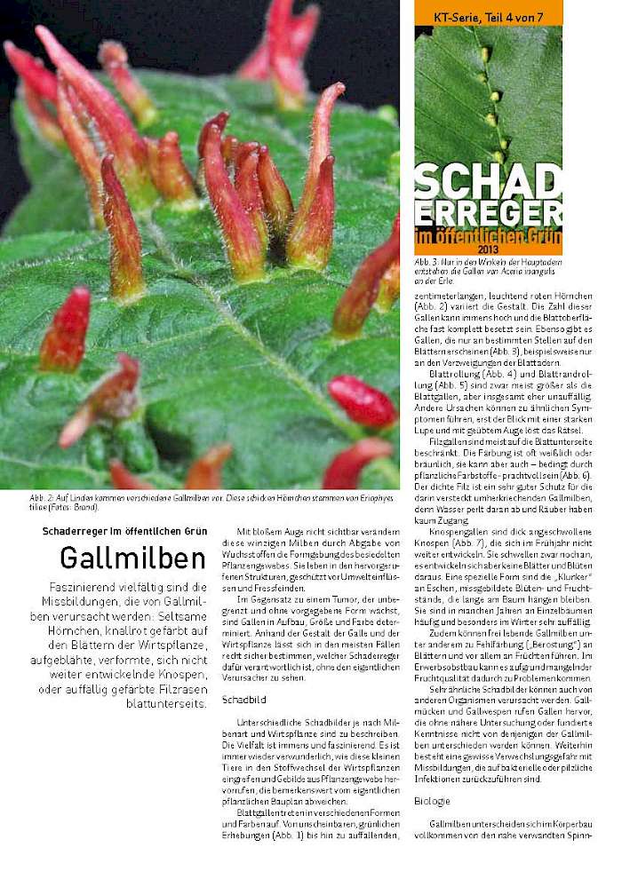 Faszinierend vielfältig sind die Missbildungen, die von Gallmilben verursacht werden: Seltsame Hörnchen, knallrot gefärbt auf den Blättern der Wirtspflanze, aufgeblähte, verformte, sich nicht weiter entwickelnde Knospen, oder auffällig gefärbte Filzrasen blattunterseits.