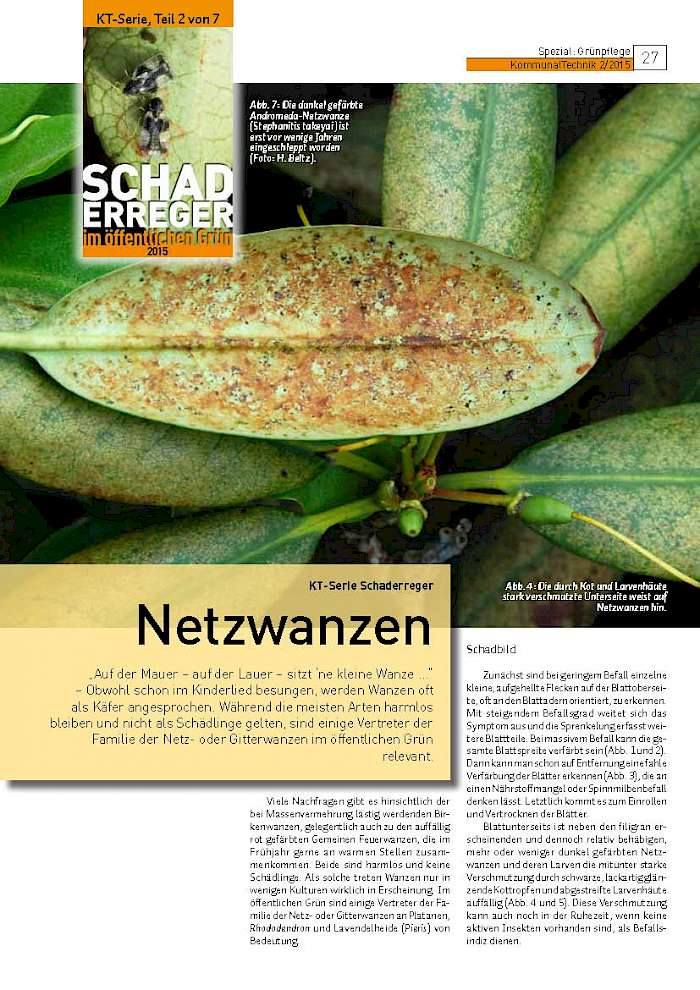 „Auf der Mauer – auf der Lauer – sitzt ‘ne kleine Wanze …“ – Obwohl schon im Kinderlied besungen, werden Wanzen oft als Käfer angesprochen. Während die meisten Arten harmlos bleiben und nicht als Schädlinge gelten, sind einige Vertreter der Familie der Netz- oder Gitterwanzen im öffentlichen Grün relevant.