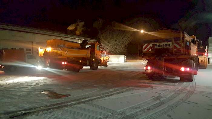 Um 3:00 Uhr am 02.01.2017: Schneefall an unserem ersten Arbeitstag, und der „Guckdienst“ informierte telefonisch alle im Winterdienstbereitschaftsplan aufgeführten Kollegen, dass die Nacht jetzt zu Ende ist. Wie in vielen Kommunen wird auch in Leopoldshöhe das neue Jahr mit Silvesterfeuerwerken begrüßt. Da im letzten Jahr die auf dem Marktplatz der Gemeinde aufgestellten Blumenkübel mehr oder weniger gesprengt wurden, haben wir sie in diesem Jahr auf dem Bauhofgelände zwischengelagert. Die Aufgabe, die Reste der Knallerei auf einer öffentlichen Fläche zu beseitigen, fällt natürlich in die Zuständigkeit des Bauhofes.