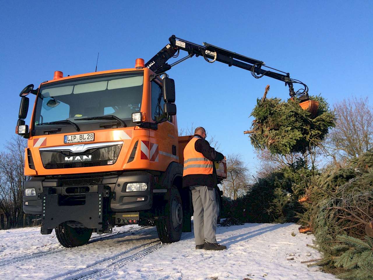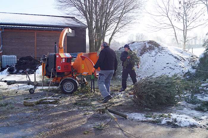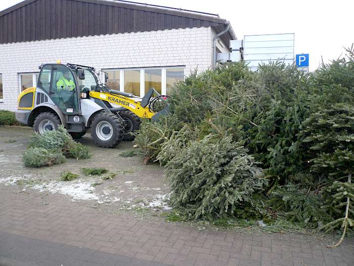 An sechs Sammelstellen in den einzelnen Ortsteilen hatten die Bürgerinnen und Bürger bis zum 16.01. die Möglichkeit, ihre ausrangierten Weihnachtsbäume kostenlos zu entsorgen. Diese Stellen werden von uns angefahren, um die Bäume per Kran auf den Lkw zu laden. Der Hauptteil dieser Tannenbäume dient als Grundlage für das große Osterfeuer des Heimatvereins, der Rest wird gehäckselt und in den Grünanlagen verteilt.