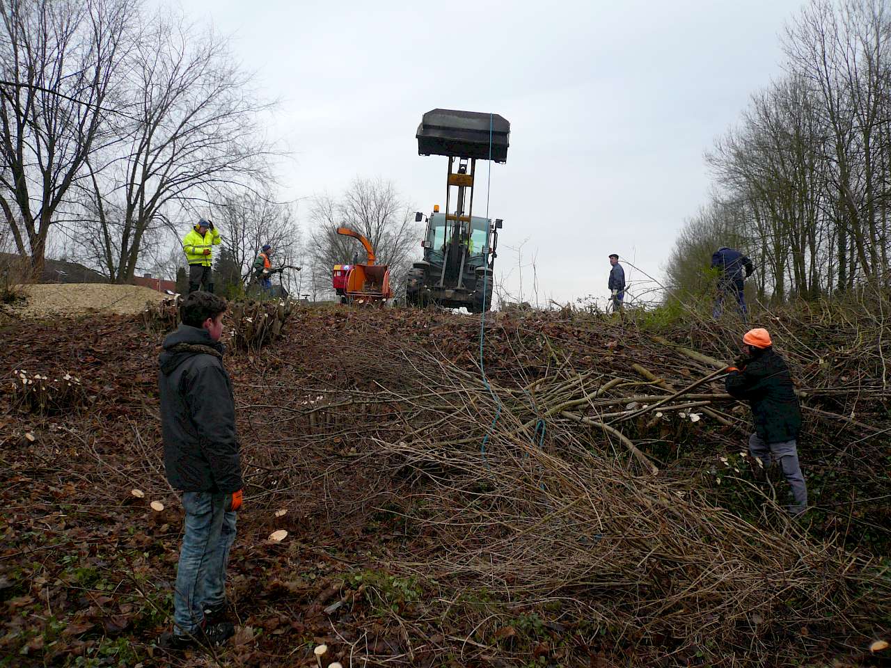 Eine nach 38 Jahren gepachtete Fläche für einen Spiel- und Bolzplatz musste bis Ende Februar komplett zurückgebaut und zurückgeschnitten werden, weil der Pachtvertrag durch die Eigentümer gekündigt wurde. Viel Arbeit für die Gärtner, aber der tiefgefrorene Boden erleichterte das Befahren der Wiese und gerade das Häckseln ließ sich dadurch wesentlich schneller durchführen.