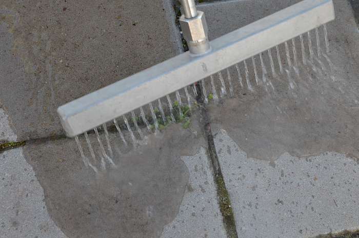 Das Wasser wird auf dem Anhänger erhitzt und fließt durch den Schlauch zur Handlanze. Thorsten Martin führt die Handlanze, aus der heißes Wasser tropft, langsam über die Wege. Systematisch beginnt er bei der am tiefsten gelegen Stelle und arbeitet sich in Bahnen vor. Andersherum könnte das herabfließende Wasser die Wirkung beeinträchtigen, da die nötige Temperatur nicht erreicht werden könnte. Für eine Wirkung muss das Wasser so heiß sein, dass die Proteine der Pflanzen zerstört werden. Da der Boden kalt ist, muss das Wasser möglichst heiß aufgebracht werden. Direkt nach der Behandlung deutet nichts darauf hin, dass die Pflanzen geschädigt sind. Der Effekt ist jedoch stark davon abhängig, um welche Pflanze es sich handelt. Gräser sind meist sehr robust – an ihnen sind Schäden erst später sichtbar. Hingegen tritt an den krautigen Blättern des Löwenzahns bereits wenige Minuten später ein Verwelken ein. Manche Blätter sehen regelrecht gekocht aus.