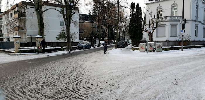 Doch die Winterdienstpflichten erstrecken sich auch auf andere, nicht markierte Querungsbereiche. Dies sind nicht nur die nicht markierten Querungsbereiche, die durch Mittelinseln („Querungshilfen“) gekennzeichnet sind, sondern vor allem auch alle nicht markierten Straßenquerungen an Kreuzungen und Einmündungen in Verlängerung der Gehwege.