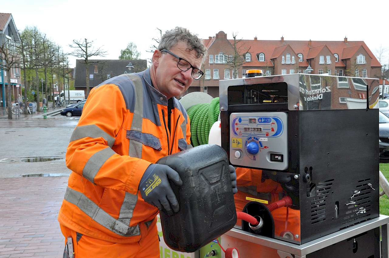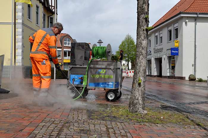 Vorab: die Innenstadt macht auf mich Anfang Mai einen sehr gepflegten Eindruck. Das mag daran liegen, dass der Frühling hier oben im Norden in diesem Jahr bisher kühl und wenig wüchsig ist, oder es wird von Seiten der Stadtverwaltung viel Wert auf ein ordentliches Erscheinungsbild gelegt. „Publikumswirksame Flächen, wie hier rund um das Rathaus und den Marktplatz oder auch Bushaltestellen, bearbeiten wir bis zu viermal pro Jahr mit dem Heißwassergerät. Ich kann aber feststellen, dass das Unkraut an einigen Stellen schon weniger wird. Dadurch, dass es nicht mehr zum Blühen kommt, gibt es kein neues Samenpotential und die Pflanzen werden auf Dauer ausgehungert“, berichtet Martin Schwermann. Er teilt sich diese Aufgabe mit einem Kollegen.