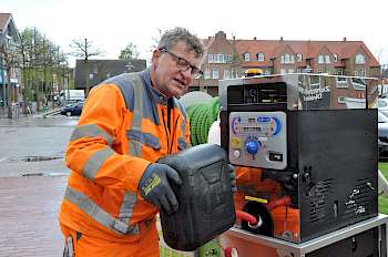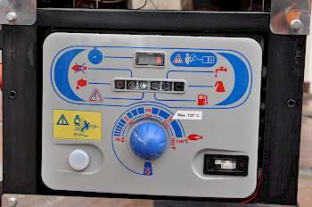 Der Stadiko Heißdampferzeuger Ökotherm arbeitet mit bis zu 130 °C heißem Wasser-/Wasserdampfgemisch, dem lediglich etwas Wasserenthärter zugefügt wird. Der Wasserdampf hat die Aufgabe, die Oberfläche anzuwärmen, damit das im gleichen Arbeitsgang ausgebrachte heiße Wasser ohne Temperaturverluste an die im Boden befindlichen Wurzeln gelangt. Durch diesen Vorgang wird in der Pflanze ein Eiweißschock ausgelöst, der die Zellwand der Pflanze nachhaltig zerstört. Die Pflanze soll nun kein Wasser mehr aufnehmen und vertrocknet. Der soeben behandelte Löwenzahn rund um ein Straßenschild erinnert etwas an gedünsteten Spinat, fällt aber nach ein bis zwei Tagen in sich zusammen und verrottet, so Martin Schwermann. Sehr gut bestockte Grasbestände seien am schwierigsten zu behandeln, denen müsse man öfter zu Leibe rücken oder auch mal händisch nachhelfen. „Da muss dann unter Umständen im Vorfeld nochmal ein Freischneider ran, so dass die Pflanze nicht mehr so viel Grün besitzt und das Heißwasser direkt an der Wurzel wirken kann“, ergänzt Helmut Schwarte. „100 °C heiß sollte das Wasser bei Benetzung sein, um eine gute Wirkung zu erzielen“, erklärt Mitarbeiter Martin Schwermann.