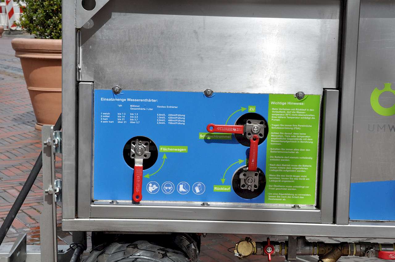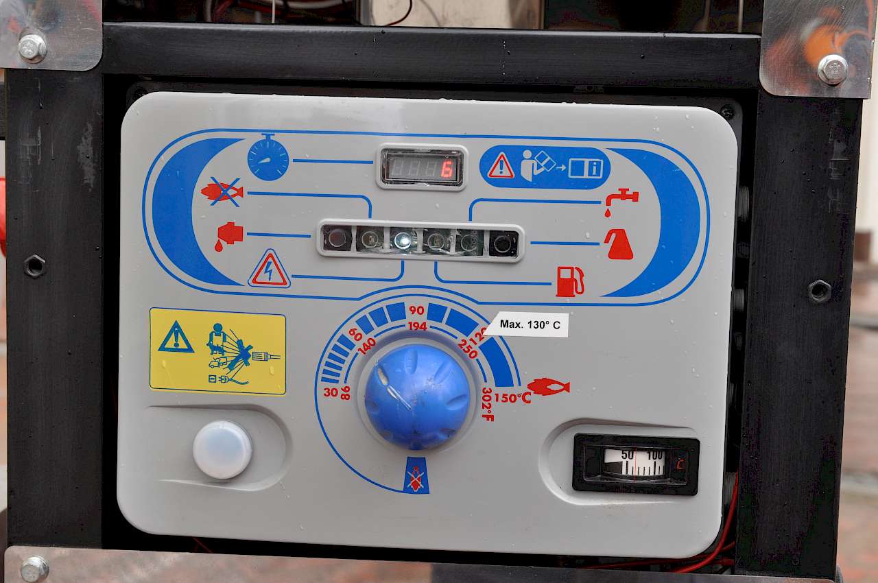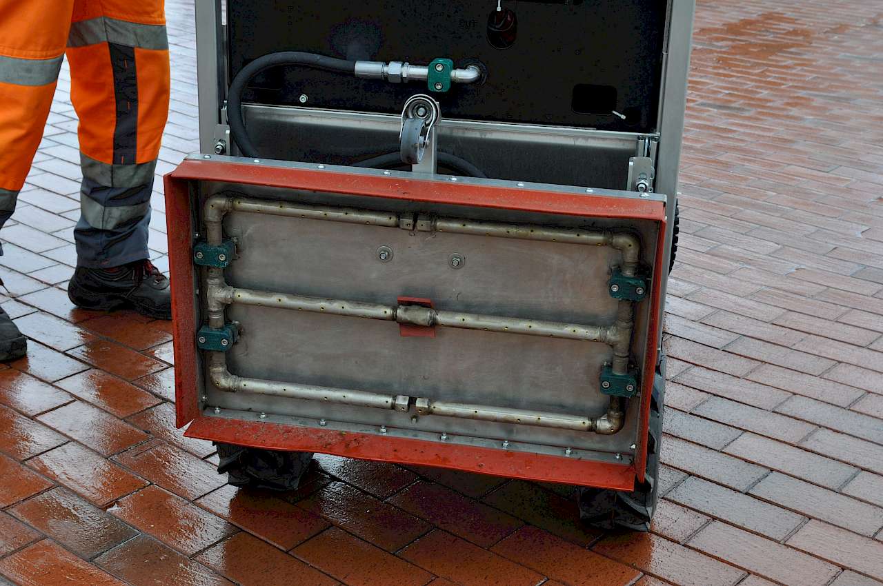 Gearbeitet wird entweder mit dem sogenannten „Flächenwagen“ oder mit einer von zwei verschiedenen Handlanzen. Diese kommen vor allem an schwer zugänglichen Stellen zum Einsatz und sind durch einen doppelwandigen isolierten Schlauch mit dem Heißdampferzeuger verbunden. Der Wassertank fasst knapp 300 l, die für rund 30 min durchgehendes Arbeiten mit dem Flächenwagen ausreichen.
