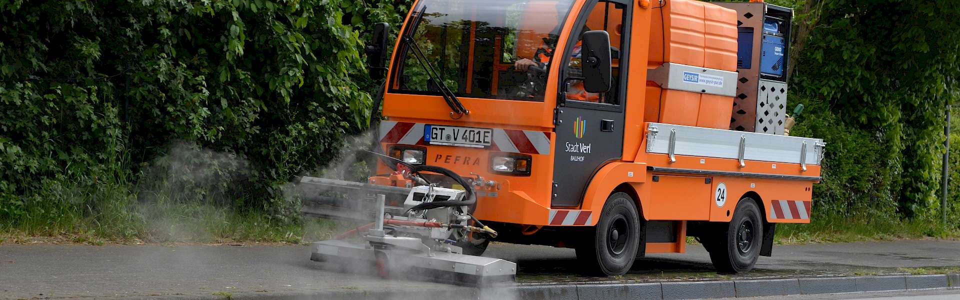 Die Suche nach einem neuen elektrisch betriebenen Geräteträger für die Wildkrautbeseitigung mit einem Heißwasser-Heißdampf-Gerät von Geysir war nicht leicht. Entweder war die Akkulaufzeit zu knapp oder die Nutzlast zu gering. Über Kontakte zu kommunalen Kollegen auf den ostfriesischen Inseln kam der Verler Bauhofleiter Martin Irmer schlussendlich zum Hersteller Pefra. Dieser passte den Geräteträger für die Bedürfnisse der Verler an. Die Redaktion KommunalTechnik hat sich die Gerätekombination vor Ort angeschaut und die Besonderheiten in einem Video zusammengefasst.